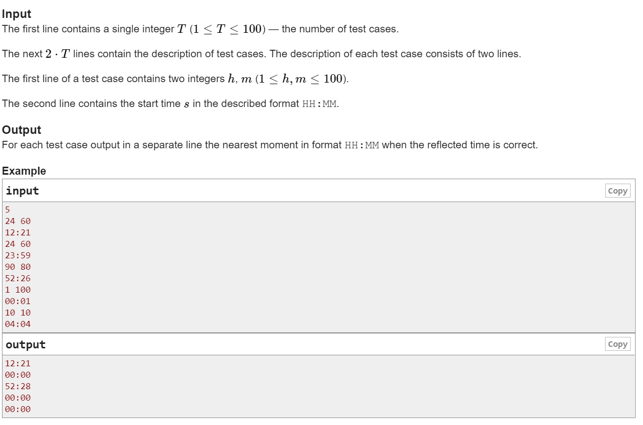 #include#define endl '\n'#define null NULL#define ll long long#define int long long#define pii pair #define lowbit(x) (x &(-x))#define ls(x) x<<1#define rs(x) (x<<1+1)#define me(ar) memset(ar, 0, sizeof ar)#define mem(ar,num) memset(ar, num, sizeof ar)#define rp(i, n) for(int i = 0, i < n; i ++)#define rep(i, a, n) for(int i = a; i <= n; i ++)#define pre(i, n, a) for(int i = n; i >= a; i --)#define IOS ios::sync_with_stdio(0); cin.tie(0);cout.tie(0);const int way[4][2] = { {1, 0}, {-1, 0}, {0, 1}, {0, -1}};using namespace std;const int inf = 0x3f3f3f3f;const double PI = acos(-1.0);const double eps = 1e-6;const ll mod = 1e9+7;const int N = 2e5 + 5;inline void read(int &x){ char t=getchar(); while(!isdigit(t)) t=getchar(); for(x=t^48,t=getchar();isdigit(t);t=getchar()) x=x*10+(t^48);}int t, h, m, x, y;bool ok(int x){ if(x<10){ if(x==0||x==1||x==2||x==5||x==8) return 1; else return 0; } else if(x==100) return 1; else{ int a = x/10, b = x%10, flag = 0; if(a==0||a==1||a==2||a==5||a==8) flag = 1; if((b==0||b==1||b==2||b==5||b==8)&&flag) return 1; else return 0; }}int fi(int x){ if(x==0||x==1||x==8) return x; //得到对应数字 if(x==2) return 5; if(x==5) return 2;}bool check(int a, int b){ if(!ok(a)||!ok(b)) return 0; //如果不可翻转 int flag = 0; if(b==100) x = 1; else x = fi(b%10)*10+fi(b/10); if(a==100) y = 1; else y = fi(a%10)*10+fi(a/10);// cout << "a: " << a << " b: " << b << endl;// cout << "x: " << x << " y: " << y << endl; if(x > t; while(t --){ cin >> h >> m; int a, b; char c; cin >> a >> c >> b; for(; ; b ++){ if(b&&b%m==0) a ++;// cout << "check: " << check(a%h, b%m) << endl; if(check(a%h, b%m)) break; } } return 0;}